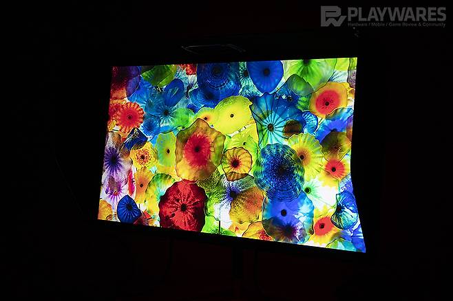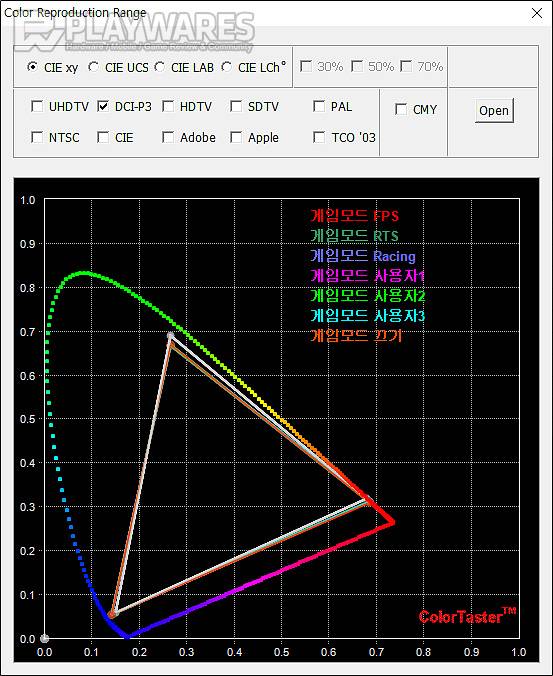 국제 산업 표준 중 광색역 특성을 가진 DCI-P3 기준에 최적화된 색상 영역을 지원하는 특징이 있습니다. 보편적인 sRGB 색상 영역을 최대로 지원하는 게이밍 모니터들에 비하면 보다 다양한 색상 표현이 가능하고 색상 자체의 진하고 연한 디테일을 연출하기 유리한 표현력을 갖추었다 할 수 있습니다. 이는 게임이나 영상 시청 등의 다양한 콘텐츠 소비 환경에서 장점으로 활용할 수 있는 요소가 되겠습니다. 색상 영역은 대체적으로 기본 특징과 동일하며, 시력보호를 위해 블루라이트 포함 영역을 감소시키는 로우블루 모드 활성화 환경에 한해 일정 수준 감소하는 식으로 차이가 발생하게 됩니다.
