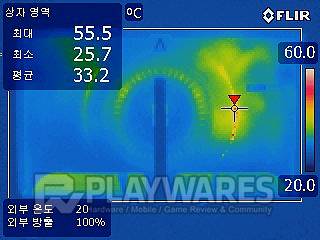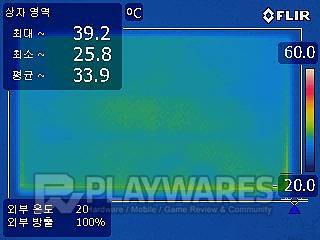 이미지는 화면을 켠 상태에서 에이징을 진행하고, FLIR사의 E시리즈로 본체 발열을 측정한 결과입니다. 본체의 평균 발열은 전후면 33-34˚C 사이, 발열이 집중된 부위는 주로 본체 후면부이며 39˚C에서 최대 55˚C 수준으로 차이가 있습니다. (플레이웨어즈 테스트 기준 / 오차 범위 존재) 발열 정도를 나타내는 수치는 측정 환경이나 방식, 기타 여러 요인에 따라 차이가 발생할 수 있으니 참고바랍니다.