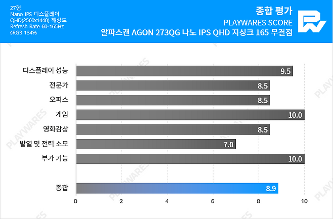 고성능 게이밍 모니터를 칭하는 기준이 더욱 상향평준화 된 시점에서 이번 알파스캔 AGON 273QG 나노 IPS QHD 지싱크 165 무결점은 QHD(Quad-HD, 2560x1440) 해상도 디스플레이를 통한 고화질 게임 화면, 응답시간 최대 ms 오버드라이브 성능 및 ms 수준으로 매우 낮게 제어되는 인풋렉(Input-lag, 입력지연), 최대 주사율(Refresh Rate) 165Hz 오버클러킹 환경에서 기대할 수 있는 매끄러움은 물론 가변 주사율 기능 NVIDIA G-Sync 또는 잔상 감소 기능 ULMB(ULTRA LOW MOTION BLUR) 옵션을 다양하게 적용할 수 있게 만든 제품으로 경쟁력을 갖추고 있습니다. 브랜드 내 프리미엄 게이밍이란 이미지를 대표하는 AGON 시리즈에 걸맞는 감성 디자인은 물론 핵심 성능과 여러 부가기능의 시너지를 통해 일반 사무용, 멀티미디어용 모니터로는 경험해보기 어려운 게이밍 환경을 제공한다에 주목해 볼 수 있습니다.