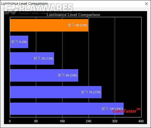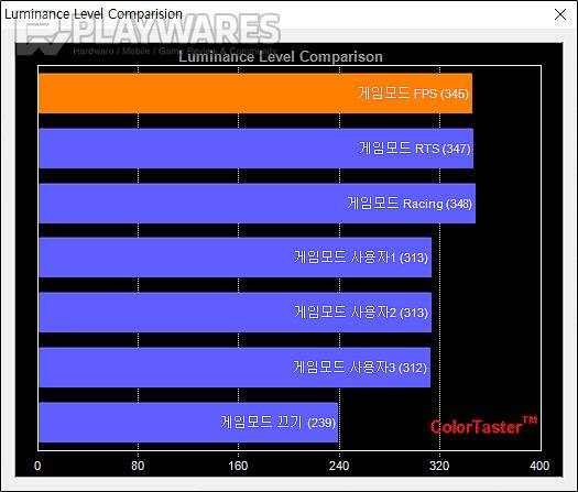 화면의 밝은 정도를 나타내는 휘도는 OSD 밝기 단계 100 기준 350nit에 가까운 고휘도 지원이 가능한 상태로 확인됩니다. 기본 밝기 설정은 250nit 수준의 단계 60을 기본으로 설정해 두었고 전용 OSD로 제공되는 게임모드를 조작하는 과정에서 대표적인 FPS, RTS, Racing 모드가 345-348nit 수준으로 높은 휘도를 지원하고 사용자 1,2,3 모드에서 300nit 초반, 기본 설정 끄기 모드 선택 기준에서는 240nit에 가까운 휘도를 지원하는 식으로 프리셋에 차이를 둔 것이 특징입니다. 휘도 관련 게임모드의 장점은 밝기 단계를 조절하지 않더라도 쉽고 빠르게 휘도를 변화시켜 화면의 밝은 정도를 달리할 수 있게 만드는 점이라 할 수 있겠습니다.