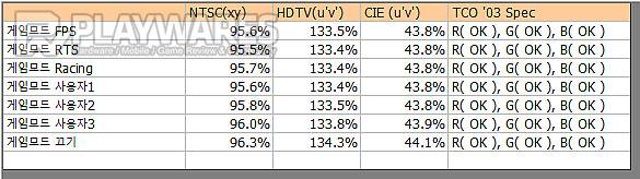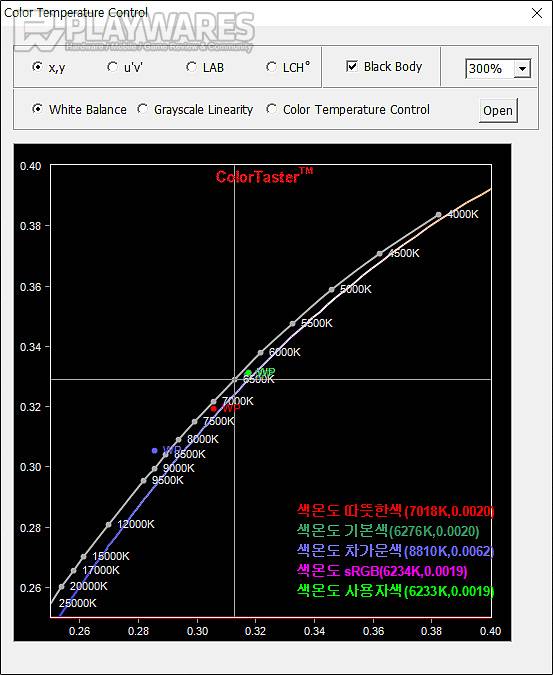 절대온도(K) 수치로 특성을 나타내는 색 온도는 사용자색 모드를 포함한 총 5가지 색 온도 모드 선택지가 있고 그 중 기본색을 초기 설정으로 지원하고 있습니다. 기본색과 sRGB, 사용자 모드에서는 대체적으로 색 온도 표준 6500K에 근접한 색 온도 프리셋을 제공받을 수 있고 차가운색의 경우 9000K에 가까운 높은 색 온도 프리셋으로 화면에 푸른(Bluish) 느낌을 강하게 만드는 특징이 있습니다. 참고할 점이라면 따뜻한색 모드에서는 7000K대 색 온도 프리셋이 제공되므로 실제 느낌은 색 온도 표준에 비해 푸른 느낌에 가깝다는 점이 있습니다. 게임모드에서는 끄기와 FPS, RTS, Racing과 같은 게이밍 모드에서 상대적으로 낮은 색 온도, 사용자 모드(1,2,3)에서는 6700-6800K 수준의 비교적 표준에 가까운 색 온도가 프리셋으로 제공되는 특징이 있으니 이 또한 체크해 두시면 좋습니다.