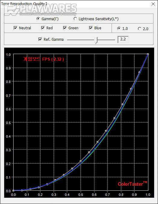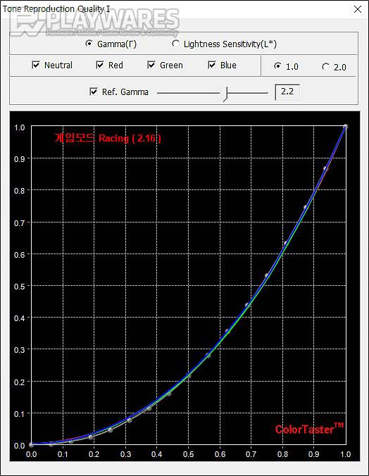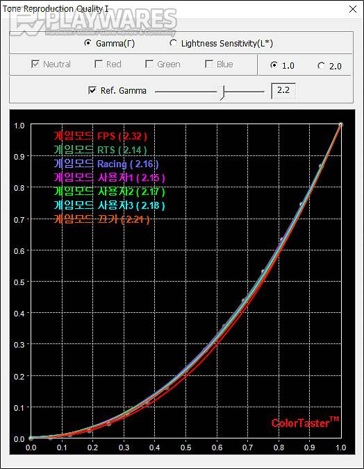 밝기 톤에 영향을 주는 감마는 3가지 타입의 감마 모드를 제공하는 게 우선적이고 이 중 표준 2.2 감마에 최적화된 감마1 모드를 기본 세팅으로 제공하고 있습니다. 감마2 모드에서는 조금 더 화사한 톤이, 감마3 모드의 경우 옵션 내 가장 진한 톤을 연출할 수 있게 감마 프리셋이 제공되고 있습니다. 게임모드의 경우 기본 감마 설정을 따라가고 있으니 이는 참고해 두시기 바랍니다. 감마는 게임을 포함한 다양한 콘텐츠 소비 환경에서 최대한 자연스러운 톤을 연출하는데 포커스를 맞추었고 이는 표준에 최적화된 각 모드별 감마 프리셋을 통해 이를 확인할 수 있습니다.