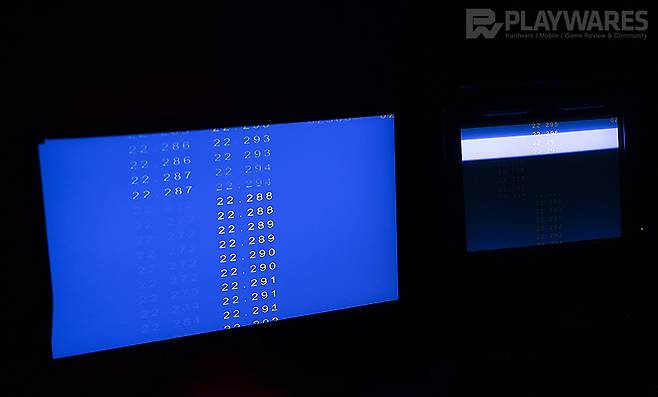 테스트용 SMTT 2.0 소프트웨어 및 인풋렉이 제로에 가까운 CRT 모니터를 대조군으로 한 환경에서 제품(사진 좌측)의 인풋렉 수치는 2-3ms(2-3/1000초) 사이로 확인되고 있습니다. 오차 범위를 감안하더라도 인풋렉 수치는 주사율(Refresh Rate) 60Hz 기준 및 최대 주사율 165Hz 환경에서 모두 1프레임을 넘어서지 않는 매우 낮은 상태이므로 빠른 입력과 피드백이 가능한 환경을 제공하는 것에 큰 메리트가 있습니다.