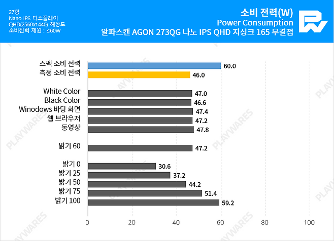 OSD 밝기 단계 60을 기본 설정으로 제공하는 환경에서 전력 소모는 평균 46W대로 확인됩니다. (플레이웨어즈 테스트 기준, 오차 범위 참고) 밝기 단계 100 기준으로 제품 내 가장 높은 59W대 전력 소모 상태가 확인되며 그 외 대부분의 환경에서는 50W 이하의 전력 소모 상태를 보여주는 게 특징입니다. 단계에 따라선 30W대의 비교적 낮은 전력 소모 환경을 유도할 수도 있으니 대략적인 변화폭을 참고해 두시면 좋겠습니다. (측정 방식이나 환경에 따라 차이가 발생할 수 있는 점 참고바랍니다.)
