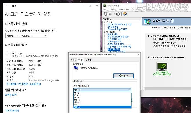 - 기본 주사율은 144Hz 설정 환경 제공, 165Hz 주사율 설정을 위해선 OSD의 오버클러킹 메뉴를 켜기 상태로 변경