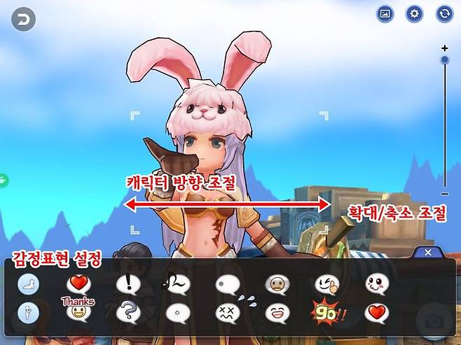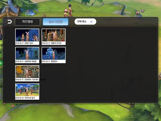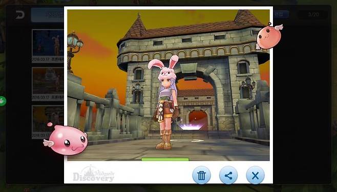 잡몹이나 NPC, 지역별 명소 등에 도착해서 카메라로 사진을 찍으면 앨범에 저장이 되고 이를 통해 일정한 보상을 얻을 수 있다. 커스터마이징 기능이 빵빵하게 들어간 PC MMORPG를 플레이하면서 자캐 사진 한 번쯤은 다들 찍어보는 게 보통이긴 하지만, 단순한 커스텀으로 구성된 라그 M에서 스크린샷 촬영이라니 약간 어색하게 느껴질지도 모르겠다.