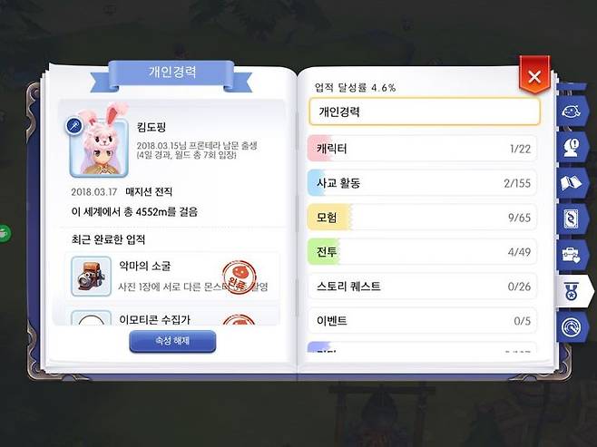 라그 M의 독특한 시스템 중 하나는 바로 모험 수첩이다. 말 그대로 캐릭터가 퀘스트를 수행하고 필드를 돌아다니는 모험에서 보고 얻은 것들이 저장되는 기능이다. 단순한 통계로는 몇 미터를 돌아다녔는지부터 어떤 몬스터를 마주쳤는지, 어떤 NPC와 만났는지까지 온갖 정보가 저장된다.