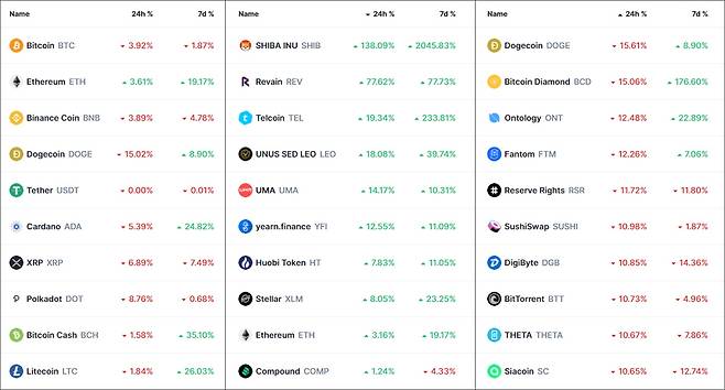 시바이누(SHIB) 외에는 리베인(REV), 텔코인(TEL)을 비롯해 디파이(DeFi) 코인인 레오(LEO), 유엠에이(UMA), 와이언파이낸스(YFI) 등이 전일 상승 TOP 10에 이름을 올렸습니다. 시바이누(SHIB)가 디파이 거래소 시바스왑의 자체 토큰이라는 점에서 몇몇 디파이 코인이 같이 오른 것으로 보여집니다.