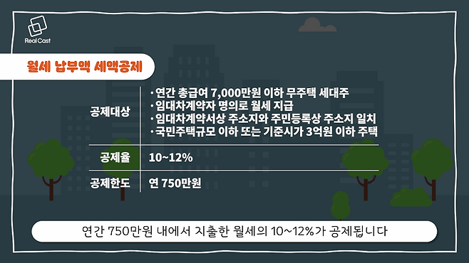 여기서 주택은 시가 3억원 이하거나 국민주택규모 이하여야 합니다. 위 조건을 모두 충족했다면, 연간 750만원 내에서 지출한 월세의 10~12%가 공제됩니다.