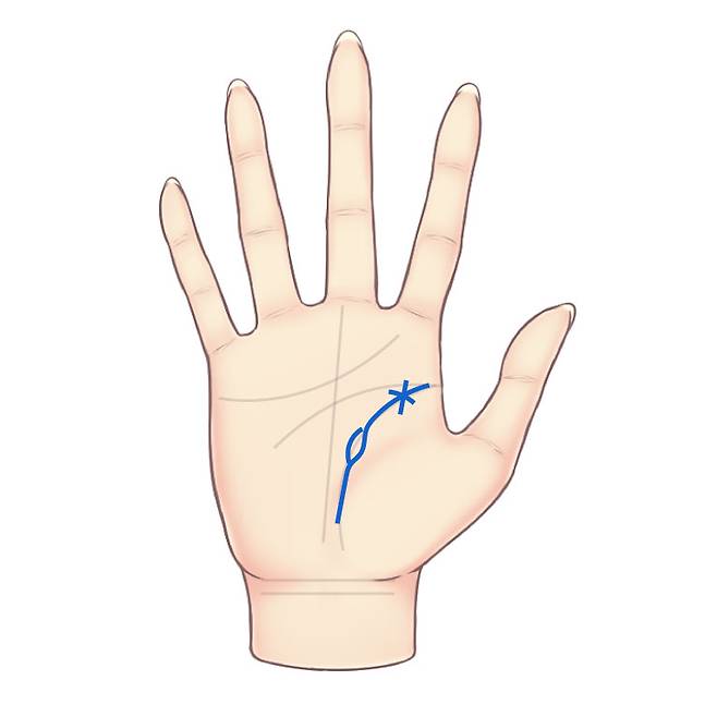 그 외에 생명선에 섬모 양이나 별 모양이 있다면 갑작스럽게 면역력이 약화되었거나 병이 생길 수 있으니 모양이 사라질 때까지 몸을 잘 관리해야 합니다. 날 때부터 이런 모양이 있는 사람들은 주로 알레르기나 천식 같은 질병을 가지고 있을 수 있습니다.