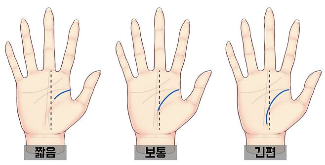 일단 생명선의 길고 짧음은 자신의 손에서 중지를 기준으로 중지까지 오지 못하면 짧은 편, 중지에서 멈추거나 조금 넘어가면 보통, 손목 아래를 향해 길게 뻗어 나가면 긴 것으로 봅니다.