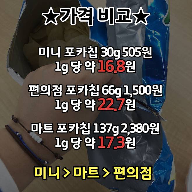 가격으로 따지자면 미니 포카칩이 제일 싼데! 미니 포카칩은 다른 과자들과 함께 묶인 번들 구매라 포카칩이 먹고 싶은 분은 마트에서 사 먹는 게 제일인 것 같음ㅇㅇ