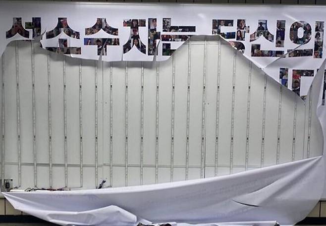게시한지 하루 만에 찢어진 지하철 광고