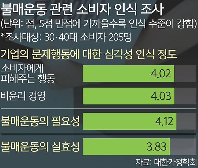 이처럼 소비를 통해 자신의 신념과 가치를 드러내는 움직임은 최근 활발히 이어지고 있다. 특히 상대적으로 구매력이 높은 30·40대 소비자는 10명 중 8명 가까이가 제품 구매를 중단하는 식으로 불매운동에 참여한 적 있는 것으로 나타났다. 지난해 10월 대한가정학회 학술지에 발표된 논문 ‘소비자불매운동에 대한 소비자와 기업 근로자 간의 인식 차이 및 불매운동 참여 영향요인 분석’에 따르면 최근 3년 내 국내 사기업 근무 경험이 없고 현재 회사를 경영하거나 대기업 프랜차이즈 가맹점을 운영하지 않는 30·40대 소비자 205명 대상으로 설문조사를 한 결과 78.0%(160명)가 특정 기업 제품 구매를 중단한 적 있었다.