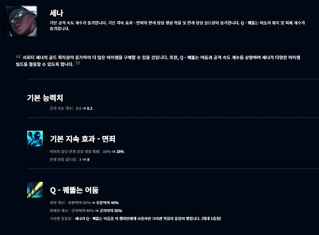 세나는 서포터로 사용될때 더 많이, 다양한 아이템을 택할 수 있도록 상향이 진행됐다. 먼저 기본 능력치의 공격 속도 계수가 0.3으로 증가했고 기본 지속 효과 면죄의 비처치 유닛 안개 망령 생성 확률이 28%로, 안개 망령 골드량이 8골드로 증가했다. Q스킬 꿰뚫는 어둠의 회복 계수는 주문력의 40%로 증가했고 피해량 계수 역시 공격력의 50%로 늘었다.