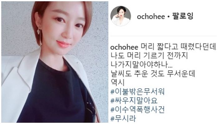 배우 오초희 씨는 인스타그램에 이수역 폭행사건을 옹호하는 발언을 했는데요. "머리를 짧다고 때렸다던데 나도 머리 기르기 전까지 나가지 말아야 하나..."라고 글을 올리고 해시태그를 #이불밖은무서워 #싸우지말아요 #이수역폭행사건 #무시라고 달았어요.