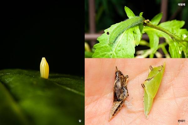 | ▲ 배추흰나비 생활사 알에서 애벌레, 번데기를 거쳐 성충으로 우화하는 나비의 일생. |