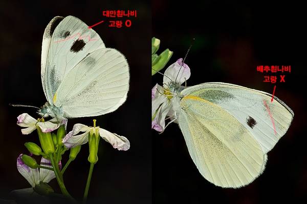 | ▲ 배추흰나비와 대만흰나비 구별법 날개 윗면을 보면 확실하게 알 수 있다. 앞날개 끝부분의 검은점 형태로 구분함. |