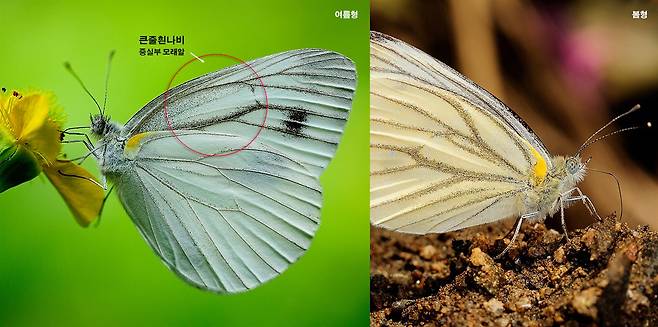 | ▲ 큰줄흰나비 여름형 봄형 비교. 발생시기에 따라 줄무늬에 상당한 변이가 있음 |