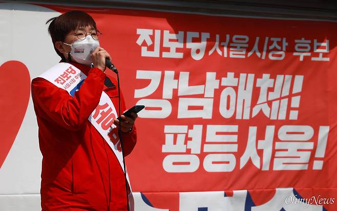 진보당 송명숙 서울시장 후보가 25일 오전 서울 세종로네거리에서 유세를 하고 있다.
