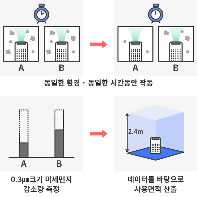 동일한 환경/시간에서 ' 0.3㎛ 크기의 미세먼지가 얼마나 감소했는지'를 측정합니다.