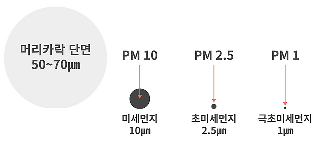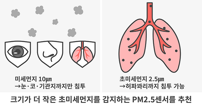 하지만 눈, 코. 기관지 등에서 걸러지는 10µm와는 달리 2.5µm 초미세먼지는 허파꽈리 등 신체의 가장 깊은 곳까지 침투하기 때문에 폐암 등의 원인이 되어 보다 위험합니다.
