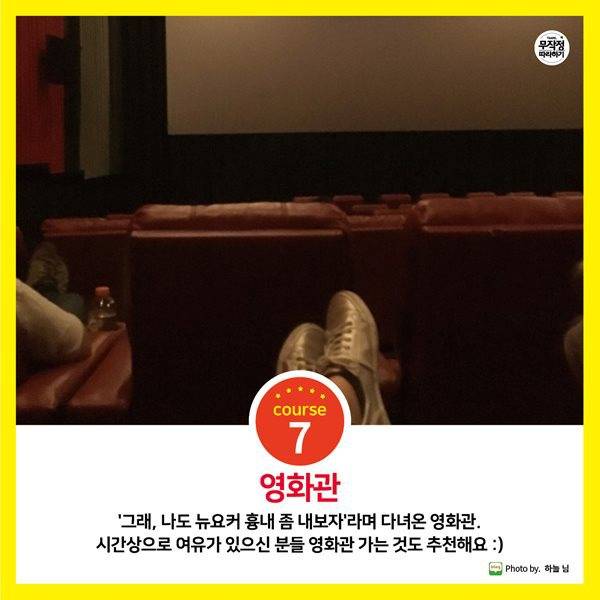 참고로 뉴욕의 영화관은 우리나라처럼 좌석을 지정하는 것이 아닌 그냥 선착순이다. 내가 원하는 자리에 앉는 그런 시스템