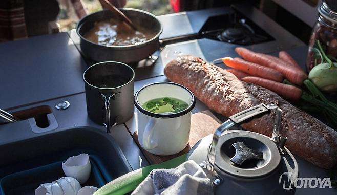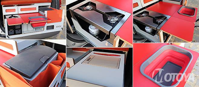후방 텐트나 어닝 확장 텐트를 설치한 뒤에, 모듈화된 가스레인지, 냉온장고를 꺼내서 사용할 수 있어 휴식 공간에서의 조리가 가능하다. 차박이나, 캠핑 시에 편리하게 사용할 수 있다.