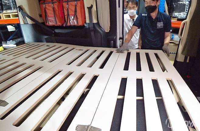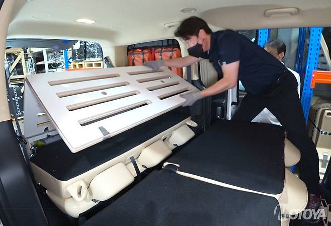 기존의 그랜드 스타렉스에 에고이 캠핑 박스를 설치할 경우에는 침대를 설치하기 위해서 2열과 3열 시트 폴딩 - 7개의 막대로 구성된 침대 받침 프레임 설치 - 침대 바닥 패널 및 매트리스 설치와 같은 과정을 거쳐야 했다.