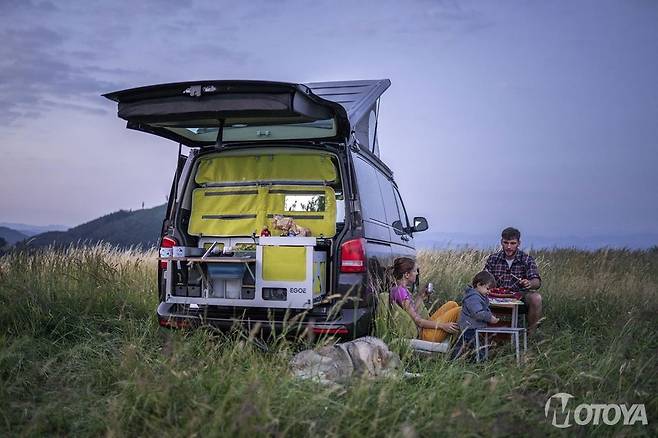 상대적으로 좁은 내부에서 거주하는 것보다는 측면의 어닝에 확장 텐트를 설치하거나, 후방의 테일게이트를 개방한 상태에서 텐트를 연계해서 설치하면 좀 더 넓고 쾌적한 휴식 공간을 확보할 수 있다.