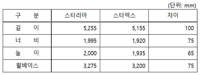 그랜드 스타렉스와의 크기 제원은 아래표를 참고하면 된다.