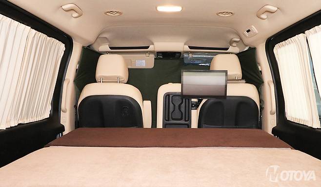 1열 운전석과 후방 창에는 패밀리카라반에서 마련한 커텐이 설치된다. 운전석 커텐의 경우에는 자외선 차단 기능이 포함되어 있다. 사소한 것으로 보일 수 있지만, 꼭 필요한 편의시설이다.