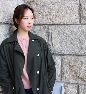 흔하게 입지 않는 컬러의 트렌치코트이다. 자칫하면 나이가 많아 보일 수 있지만 허리의 끈을 뒤에 리본 형태로 묶으면 그 단점을 충분히 보완할 수 있다.