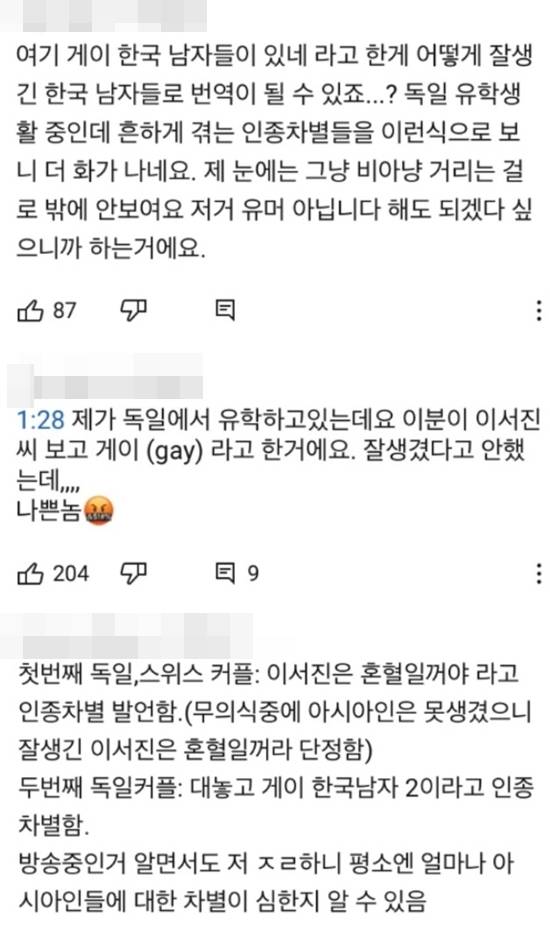 독일 유학 중인 한 네티즌은 "'게이 한국 남자들'이라는 말이 어떻게 '잘생긴 한국 남자들'로 번역될 수 있나. 유학 중에 흔하게 겪는 인종차별 발언인데 화가 난다. 제 눈에는 비아냥으로 밖에 안 보인다"고 분노했다.