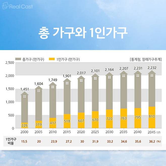 국가통계포털(KOSIS) 자료에 따르면, 지금 추세대로 우리나라 1인 가구가 계속 증가할 경우, 오는 2045년 우리나라 1인 가구수는 총 809만8369가구에 이르러 전체 가구수(2,231만7526가구)의 36.6%를 차지하게 됩니다.