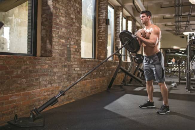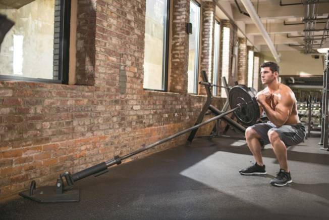 운동법: 바벨 한쪽 끝을 랜드마인에 연결하거나 벽 모서리에 고정하자. 중량을 끼우고 양 손으로 바벨을 잡아 턱 밑에 들자. 뒤꿈치에 체중을 싣고 넓적다리가 바닥과 평행이 될 때까지 내려가자. 가슴을 편 상태로 힘차게 올라오자.