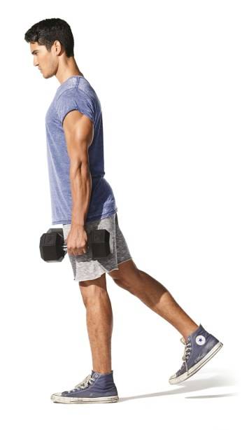 운동법: 바닥을 밟은 다리의 무릎을 살짝 굽히자. 뒷다리와 척추를 일직선으로 유지하면서 하강하자. 손이 무릎 바로 밑에 오거나, 햄스트링이 충분히 늘어난 느낌이 들면 정지하자. 허리가 다 펴질 때까지 엉덩이를 앞으로 밀어서 출발점으로 돌아오자.