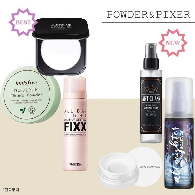 '수부지' 들의 파우치 속 필수 템은? 건조를 막고 메이크업 상태를 유지해주는 픽서, 유분 잡고 지속력 높여주는 피니시 파우더가 기본. 파우더를 휴대하기 어렵다면 브러시에 파우더를 묻혀 지퍼백에 담아 휴대하면 편리하다.