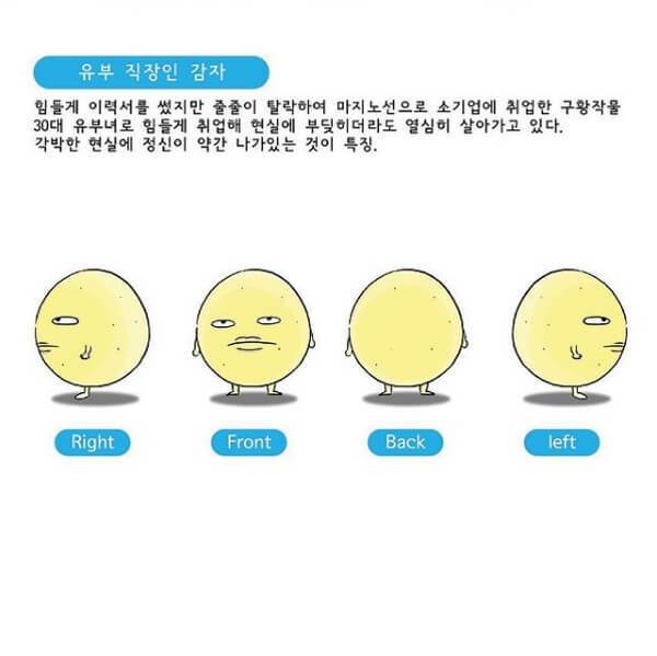 직장인 감자에서 퇴사 준비생 감자로, 백수 감자에서 유부녀 감자로. 감자의 변화는 아무도 막을 수 없다. 감자는 일상의 희로애락을 감자 캐릭터에 담으며 독자들에게 깊은 공감을 얻는다. 블랙회사에서 빠져나온 일부터 남편 ‘훈남 씨’와 일사천리로 결혼을 진행한 일, 강원도 산골에서 운전면허를 따게 된 일까지. 모두 소소하고 지극히 일상적인 에피소드지만 옆집 언니가 들려주는 듯한 친근함은 어디에도 없는 특별한 매력이다. 때로는 씁쓸한 일상까지 숨기지 않고 자신의 방법대로 보여주는 인스타툰, 쿨한 듯 쿨하지 않아서 더 인간적인 감자의 하루하루를 함께 들여다보자.