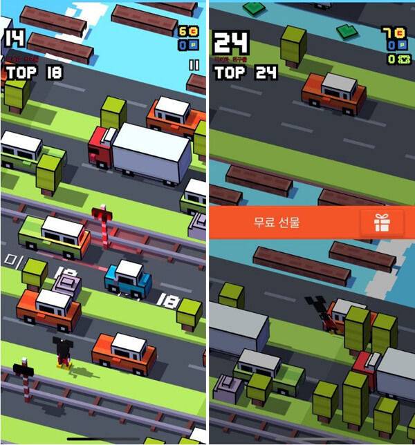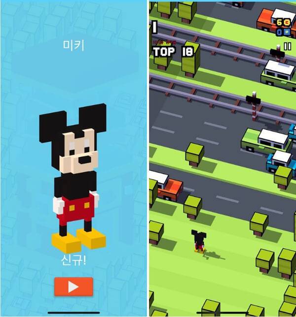디즈니 길건너 친구들은 이름 그대로 디즈니 캐릭터와 함께 길을 건너는 게임이다. 게임을 시작하면 캐릭터를 랜덤으로 뽑을 수 있으며, 이 캐릭터와 함께 안전하게 길을 건너면 된다. 화면을 탭하면 캐릭터가 한 칸씩 이동하는 방식으로 아주 간단해 보이지만, 건널목에 있는 차들이 생각보다 쌩쌩 달려 타이밍을 맞추기가 쉽지 않다.