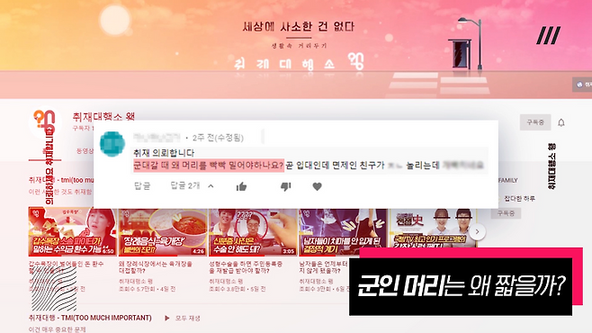 유튜브 댓글로 “왜 군인들은 머리를 짧게 잘라야 하는지 알아봐 달라”는 의뢰가 들어와 취재해봤다.