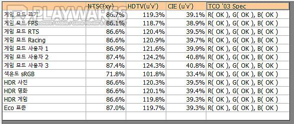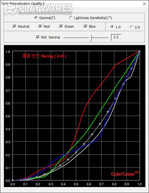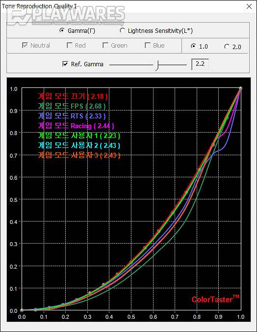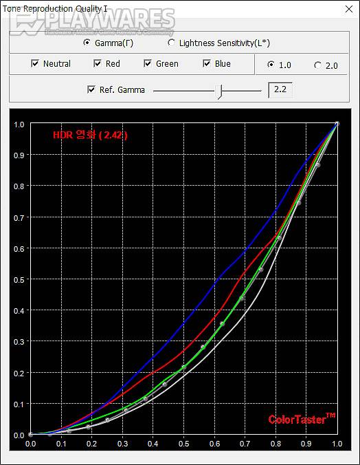 밝기 톤에 영향을 주는 감마는 3가지 타입의 감마 메뉴 선택이 가능하고 전용 게임 모드 및 HDR 모드의 프리셋으로 변화를 줄 수 있는 게 특징입니다. 표준 2.2에 가까운 감마1 모드가 최초 설정으로 제공되고 사용자 선택에 따라 조금 더 화사한 느낌의 감마2 모드 또는 진한 느낌을 보이는 감마3 모드를 선택할 수 있고 게임 모드나 HDR 모드에서는 기본 끄기 설정에서 시작해 상당히 화사한 톤이 연출되는 FPS나 RTS, Racing과 같은 게임 모드 및 마찬가지로 역동적인 느낌으로 화면이 변화되는 HDR 모드 영화, HDR 게임과 선택지가 제공되는 구성입니다. 다용도 목적에 어울리는 자연스러운 톤과 특유의 프리셋으로 다이내믹한 화면을 연출할 수 있는 게임모드, HDR 모드에 주목해 볼 수 있습니다.