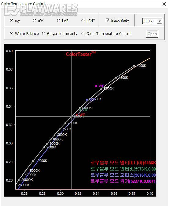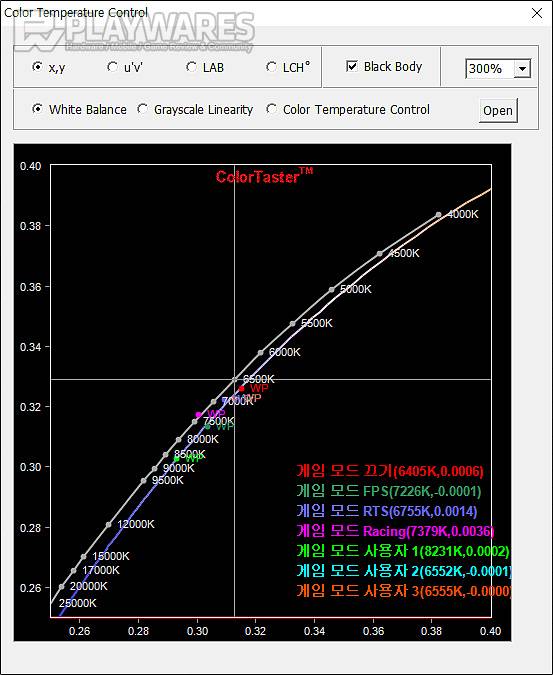 절대온도(K) 수치로 특성을 표현하는 색 온도의 경우 sRGB를 포함한 5가지 색 온도 모드 선택이 가능하며 그 중 기본은 6400K 수준의 따뜻한색에 맞추어진 상태입니다. 표준 6500K에 상당히 가까운 따뜻한색, sRGB 모드가 있고 그보다 조금 높은 색 온도로 푸른(Bluish) 느낌을 갖는 기본색 및 가장 푸른 느낌이 강한 차가운색을 선택해 볼 수 있습니다. 색 온도는 시력보호를 위해 블루라이트를 감소시키는 로우블루 모드 단계에 따라서도 변화가 있고 블루라이트 감소 정도가 가장 큰 읽기에서 5000K 초반의 색 온도로 화면에 붉은(Reddish) 느낌을 강하게 만드는 차이가 있으니 참고하시면 좋겠습니다. 게임 모드의 경우 기본 끄기와 RTS, 사용자 2,3 모드가 표준 6500K에 가까운 상태이며 FPS, Racing, 사용자1 모드에서는 그보다 높은 색 온도고 푸른 느낌이 강해지는 프리셋이 저장되어 있습니다.
