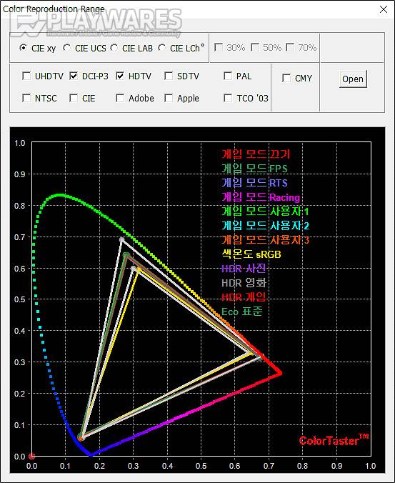 영화 산업용 색상 표준 DCI-P3에 가까운 광색역을 특징으로 갖는 디스플레이입니다. 보편적인 모니터의 색상 표준 sRGB 색상 영역보다 표현 범위가 넓기 때문에 보다 진하고 디테일한 색상을 표현해낼 수 있는 게 특징이며 이는 게임이나 사진, 영화 감상 전반에서 메리트로 작용하겠습니다. OSD 메뉴의 대부분이 이와 유사한 특징을 갖는 가운데 색온도의 sRGB 모드 선택 시에는 해당 표준에 가까운 색상 영역으로 변화가 이루어지므로 필요하다면 2가지 색상 영역을 오가며 게이밍 또는 다용도 작업 환경을 만들수도 있습니다. 그 외 색상 영역은 Eco의 읽기 모드 선택 시 흑백의 화면이 연출되는 특징이 있고 시력보호를 위해 블루라이트 포함 영역을 감소시켜주는 로우블루 모드 적용 과정에서 큰 변화가 있으니 참고하시면 좋겠습니다.