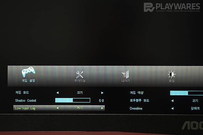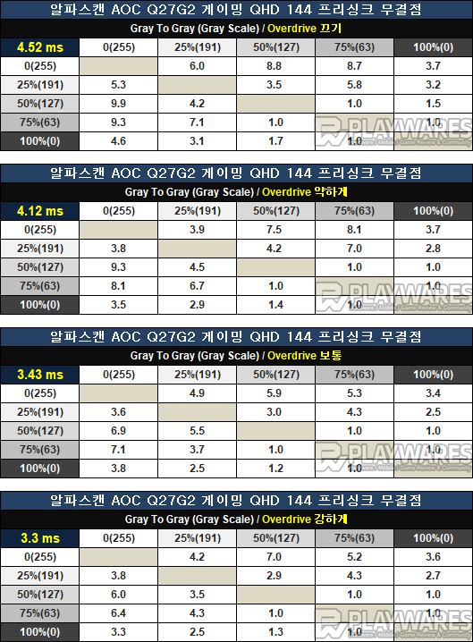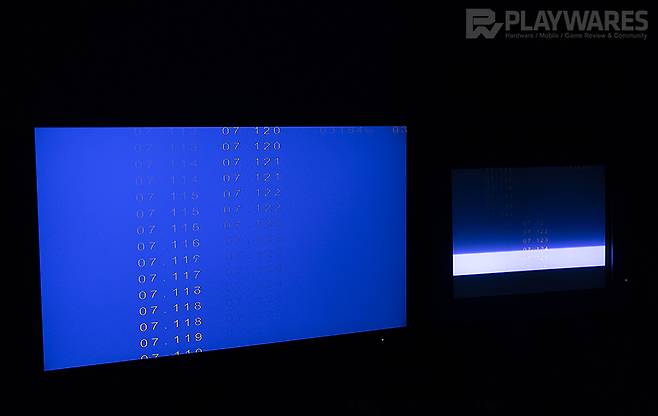 색상 전환, 잔상 특성과 연관되는 응답시간은 OSD의 4단계 Overdrive 메뉴에서 사용자 설정이 가능합니다. Overdrive의 기본 끄기 단계에서 응답시간은 4ms 중반대로 확인되며 약하게, 보통, 강하게 순으로 높아질수록 오버드라이브가 높게 적용되는 가운데 가장 낮은 경우 3ms대 초반까지 응답시간 단축이 가능해집니다. 그 과정에서 눈에 띄는 고스팅(역잔상) 현상은 확인되지 않고 있으니 가장 높은 강하게를 적용한 상태로 빠른 응답시간을 기대하며 게이밍 환경을 구성할 수 있는 게 장점이라 하겠습니다. (데이터는 플레이웨어즈 테스트 환경 기준이며 테스트 환경이나 방식에 따라 어느정도의 편차는 존재하겠습니다. 잔상이나 역잔상을 체감하는 부분 역시 개인차가 존재하는 영역이므로 해당 사항을 참고해 주시기 바랍니다.)