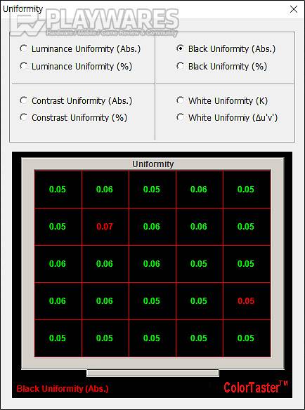 디스플레이는 VA 액정 방식으로 암부 표현 테스트 항목에서 0.05-0.07 nit 사이의 균일도가 좋은 저휘도 블랙(Black) 색상, 이를 기반으로 한 명암 대비 특성은 1800:1에서 많게는 3800:1에 가까운 고대비 화면을 특징으로 합니다. 게임 모드 선택에 따라 수치상의 차이가 발생하더라도 전반적인 특성은 VA 액정 특유의 심도있는 블랙 및 대비 특성을 지원한다 할 수 있겠습니다. 다만, 화면의 균일도나 빛샘 관련 특성은 동일 제품간에도 차이가 발생할 수 있는 점 참고하시면 좋습니다.