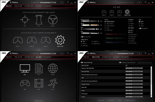 - 밝기 최적화 모드 Eco 및 장르별 게임 모드, 게임 색상, Shadow Control, 프레임 카운터와 같은 최적화 설정 제공