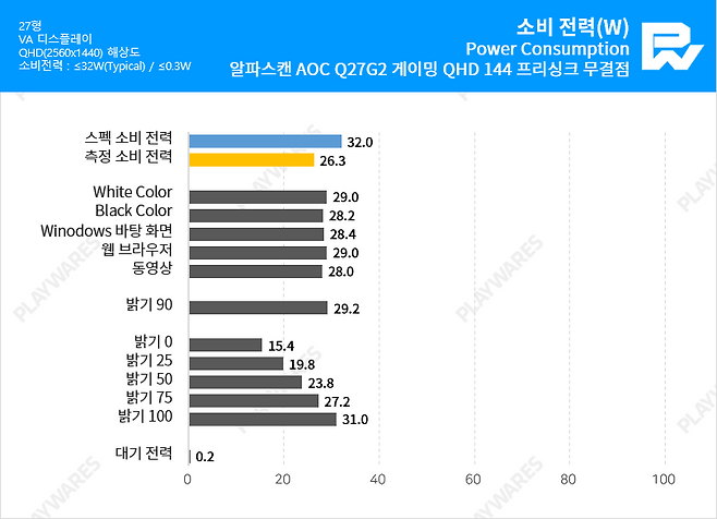 OSD 메뉴의 밝기 90을 기본 설정으로 한 화면에서 전력 소모는 평균 26W대로 확인됩니다. 전력 소모 상태가 가장 높은 경우는 밝기 단계 100의 30W 초반이며 단계를 낮출 경우엔 15W 수준의 저전력 환경을 만들 수도 있습니다. 대기 전력의 경우 0.2W 수준을 유지하고 있습니다. (전력 소모 제원 32W / 대기전력 0.3W)