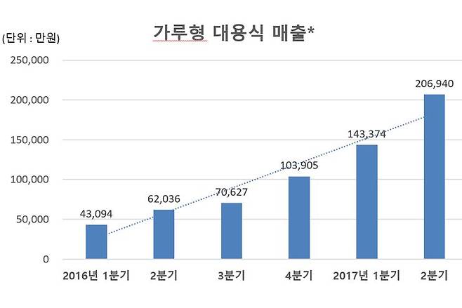 미국 시장과 달리, 국내 시장에서는 역시 가루형 제품이 압도적으로 인기가 많다. 랩노쉬도 밀스도 주력 제품은 모두 가루 형태이다. 가루형 대용식 시장은 2016년 1분기 대비 2017년 2분기 매출이 약 5배 성장했다. 불과 1년 사이에 일어난 일이다.