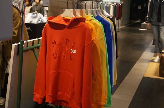 비비드한 색감의 화사한 옷들이 디피되어 있어